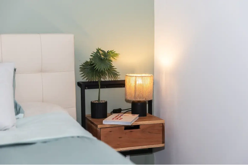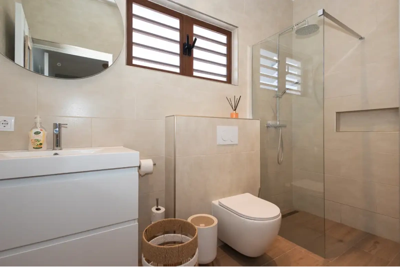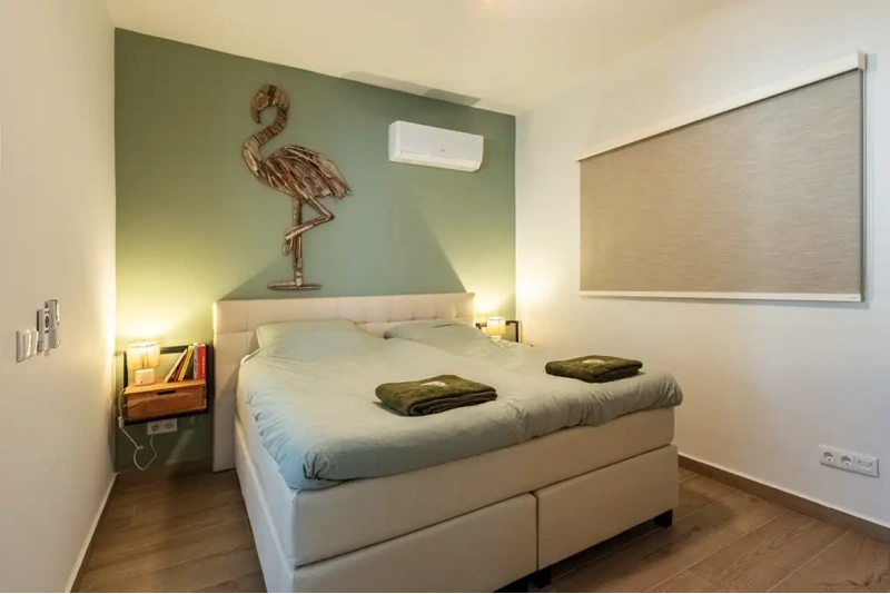 • Een stijlvolle slaapkamer met een en suite badkamer. De slaapkamer is voorzien van airco en plafondventilatie voor optimaal comfort.